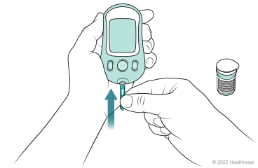 Take one strip from the bottle of test strips. Follow the directions to prepare your meter to receive the blood sample. Don't forget to put the lid back on the bottle right after removing the strip.