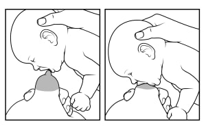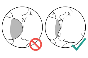 Look for a good latch. Make sure that your nipple and much of your areola are in your baby's mouth. Your baby's lips are flared out, not folded in.