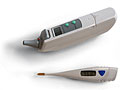 These are also plastic, but they come in different shapes. The small cone-shaped end of the thermometer is placed in the ear. Body temperature is shown on a digital display. The results appear in seconds. Some models also show what the oral and rectal readings would be.