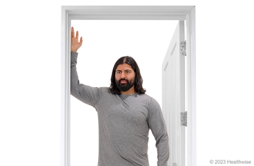 - Stand in a doorway and place one forearm against the door frame. Your elbow should be bent and a little higher than your shoulder.