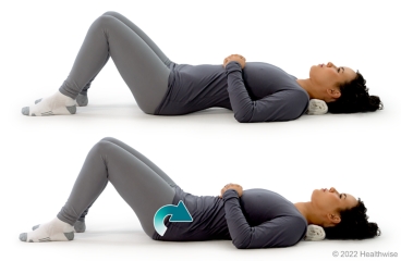 - Use your hands to gently pull your knee toward your opposite shoulder. You should feel a stretch in your buttock and hip.