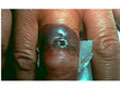 - The bump becomes a painless, fluid-filled blister and later forms a black center of dying tissue.