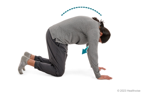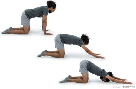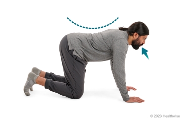 Keep your knees and shoulders in place, but allow your head to bow toward the floor. Try not to let your chin fall to your chest.