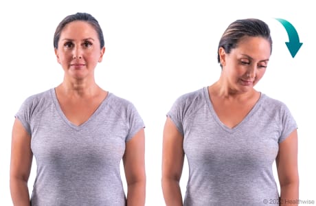 Turn your head slightly toward the direction you will be stretching. Tip your head diagonally, bringing your chin toward your chest. Relax and let the weight of your head stretch your muscles. Hold this position for 15 to 30 seconds.