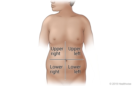 One way to describe the location is to think about your belly as having four sections. With your belly button in the center, the four sections are upper left, lower left, lower right, and upper right. You can describe the sections from your own point of view.