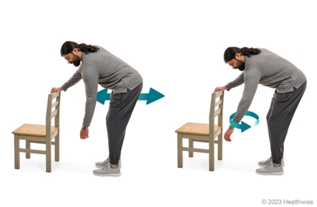 Hold on to a table or the back of a chair with your unaffected arm. Then bend forward a little and let your affected arm hang straight down. This exercise does not use the arm muscles. Rather, use your legs and your hips to create movement that makes your arm swing freely.